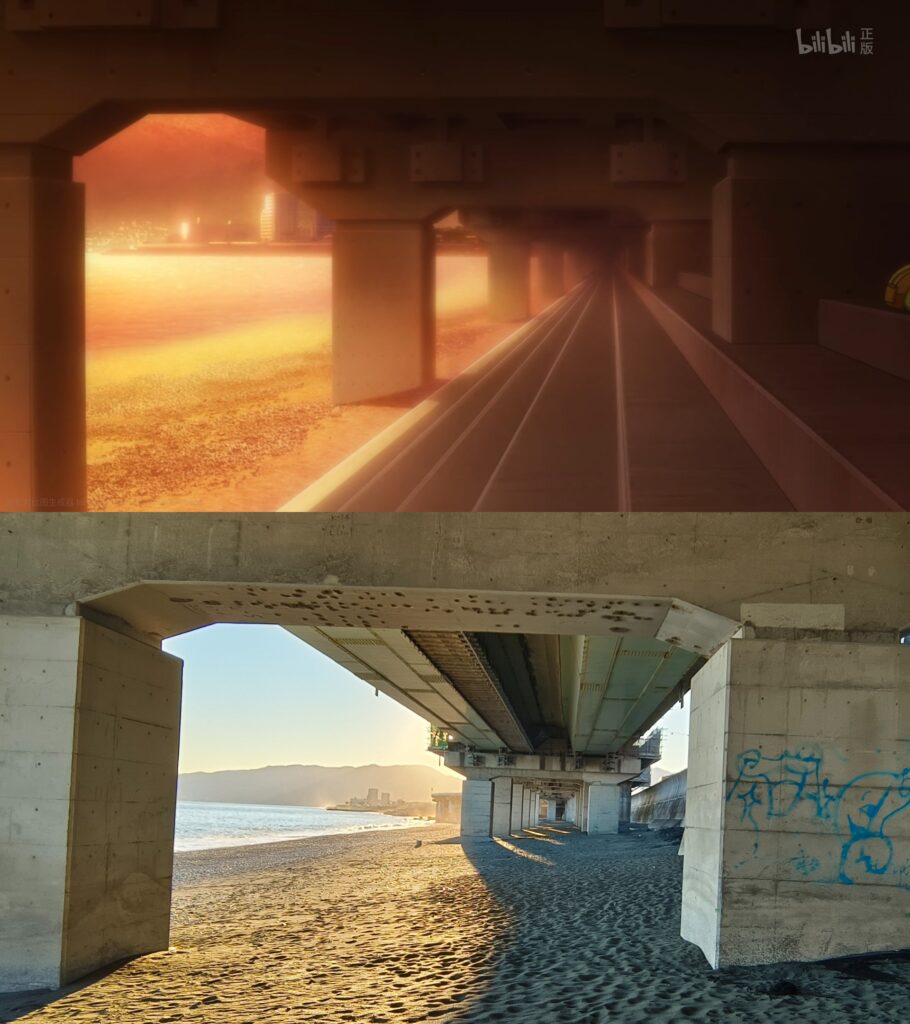正在大家都沉浸在悲伤的氛围时,果果提醒不快点可能赶不上回去的电车,试图打破阴郁的空气。但实际上动画中展示的并不是距离海岸最近的国府津站,而是距此12公里外的“根府川”站,这可能是因为根府川站是“关东车站百选”之一。